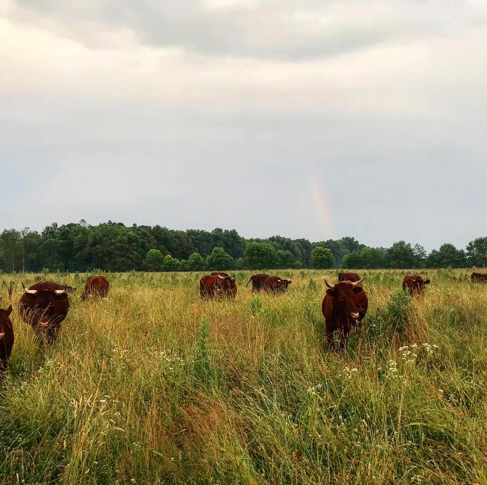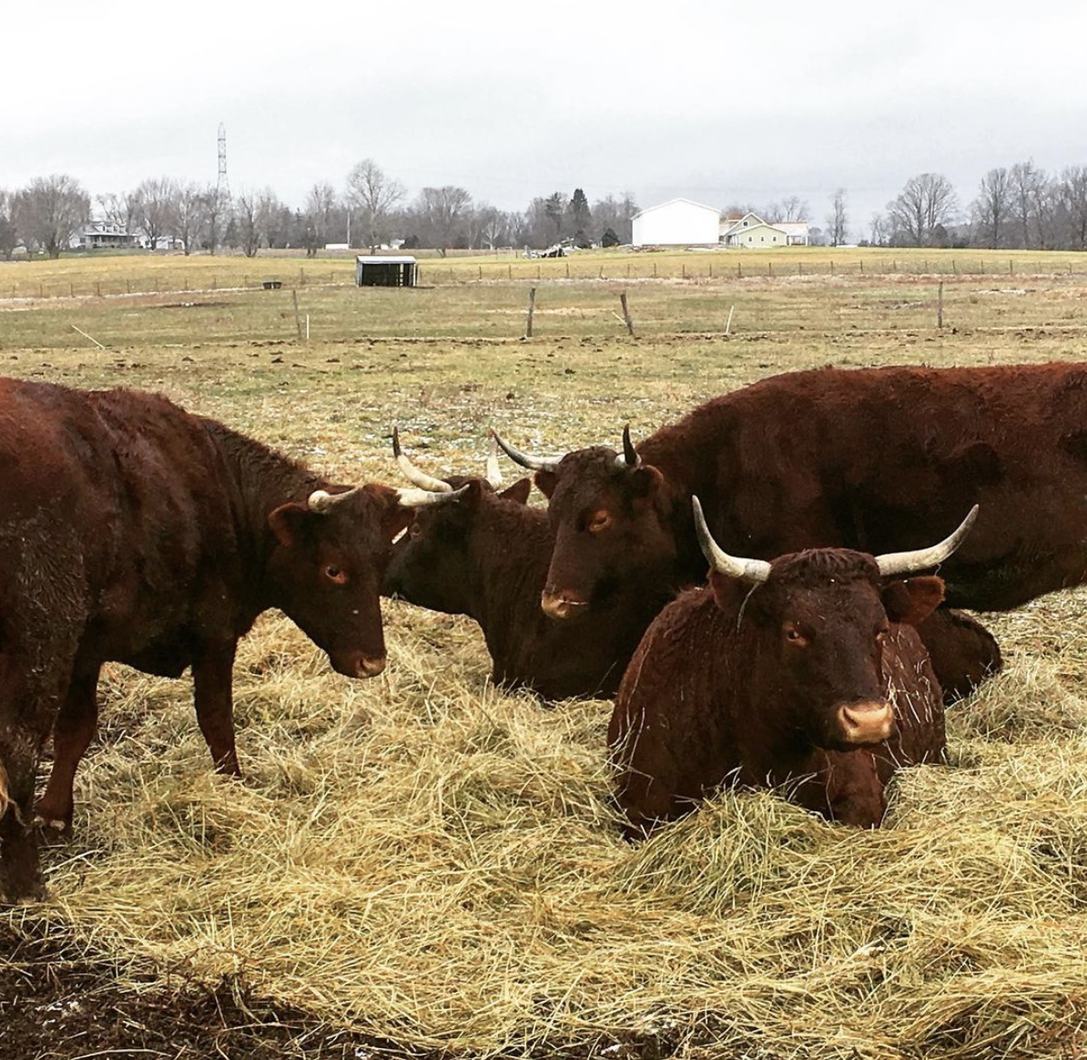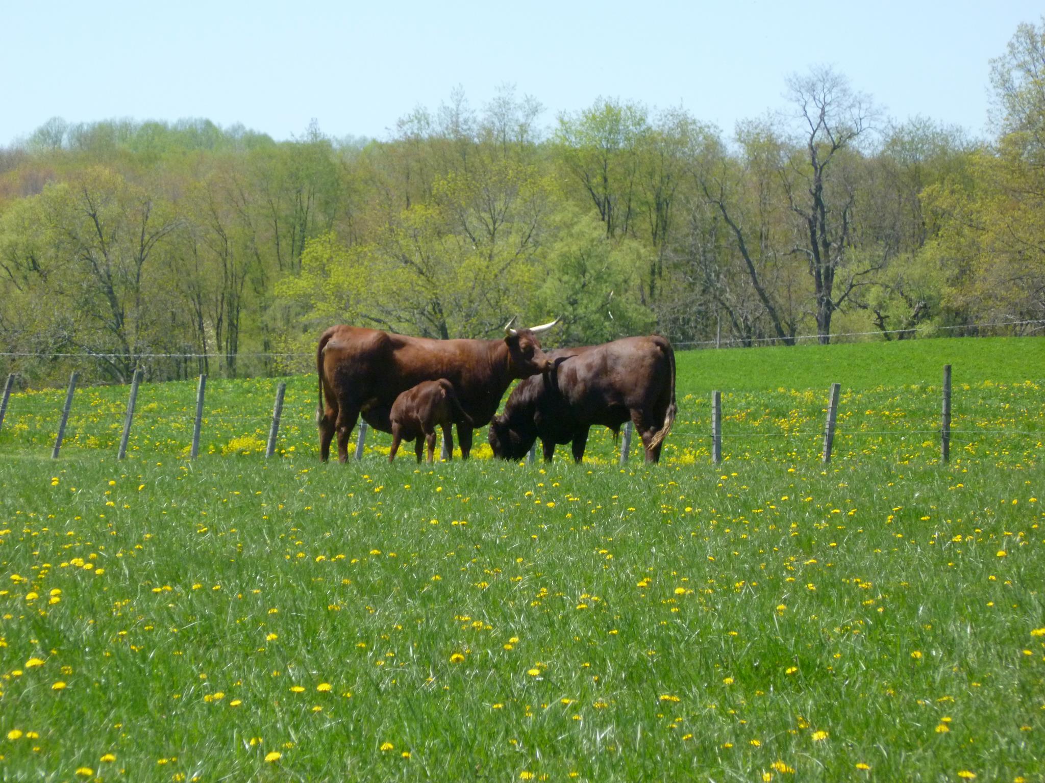It's true! Slow growing, old fashioned British breeds make some of the juiciest, most flavorful grass fed beef around. Meat rich with beefy flavor and fine, juicy texture – all on a grass only diet – special enough to be included on the Slow Foods Ark of Taste! Our herd of rare American Milking Devons are about as close to their British roots as can be. We follow non-certified organic methods and the cattle eat only grass and hay grown here at home.